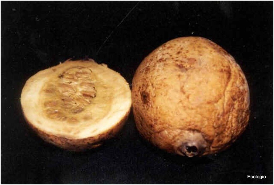 FRUTO bagas subglobosas é redondo, macio quando maduro e apresentam casca enrugada, coriácea e de cor parda acinzentado de 12 cm de diâmetro.